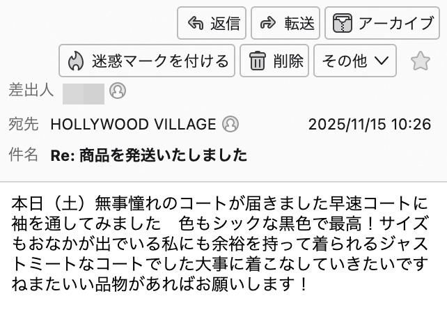 この度は当店をご利用くださり、誠にありがとうございました。サイズがぴったりとのことで安心いたしました。ぜひ末長くご愛用いただけましたら幸いでございます。また、サングラスの方もご検討中とのことで、誠にありがとうございます。こちらのウールコートとサングラスを組み合わせていただくと、おっしゃるとおり、レオンのファッションが完成するかと存じますので、ぜひお試しいただけましたら幸いです。またご縁がございました際は何卒宜しくお願い申し上げます。この度は本当にありがとうございました。(2023/12/04 16:31:30)